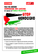 Como sabes, desde hace dos años el pueblo palestino sufre un genocidio que ha arrasado pueblos enteros, hospitales y colegios, y que ha acabado con la vida de miles personas.Un genocidio que vulnera de forma sistemática los derechos humanos más básicos y destruye las condiciones de vida en Gaza.Ante esta barbarie y la pasividad de la comunidad internacional, nos vamos a movilizar el 15 de octubre.¡Desde los centros de trabajo alzaremos la voz para reclamar el fin del genocidio!Convocamos paros con cobertura legal, asambleas y concentraciones, y minutos de silencio y actos de solidaridad.
